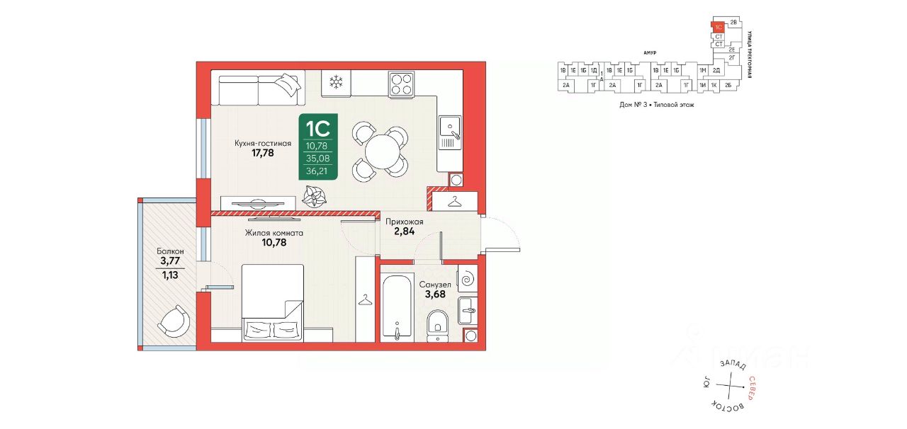 Продаётся квартира-студия площадью 28,24 кв.м на 3 этаже 10 этажного дома (Корпус 11, Секция 2) проекта ПИК Северный парк. Светлый просторный подъезд на уровне земли, функциональная планировка, большие окна, без отделки. ''Северный парк'' - жилой квартал в развитом Железнодорожном районе Хабаровска с закрытыми дворами-парками, школой, детским садом и спортхабом. До центра города получится добраться за 10 минут на автомобиле. ''Северный парк'' возводится на пересечении улиц Воронежской и Совхозной, в 10 минутах езды от центра Хабаровска. В проекте будет 30 корпусов. На входе в жилой квартал появится Welcome plaza - площадь с малыми архитектурными формами. Входы в подъезды ''Северного парка'' мы сделаем на уровне земли для комфортного перемещения по территории квартала любым способом: пешком, на самокате или с коляской. Благодаря панорамному остеклению, которое пропускает много естественного света, первые этажи будут просторные и светлые. В квартирах предусмотрены большие окна, застеклённые балконы и лоджии - будет светло и уютно даже зимой. Все квартиры сдаются с предчистовой или полной отделкой на выбор. В каждом дворе будет парк - тихое приватное пространство для жителей, где красиво и уютно в любое время года и можно расслабиться после рабочего дня. Через весь квартал протянется широкий пешеходный бульвар с велодорожками, велопарковками, зонами для отдыха, детскими и спортивными площадками. В ''Северном парке'' будет всё необходимое для комфортной жизни: на первых этажах откроются магазины, кафе и полезные сервисы. Внутри жилого квартала запланировано строительство школы и детского сада. Для удобства жителей предусмотрены многоуровневые паркинги, индивидуальные кладовые и колясочные. Артикул 989261 (Застройщик ООО ''СЗ ПРОЕКТ СТРОЙ'')