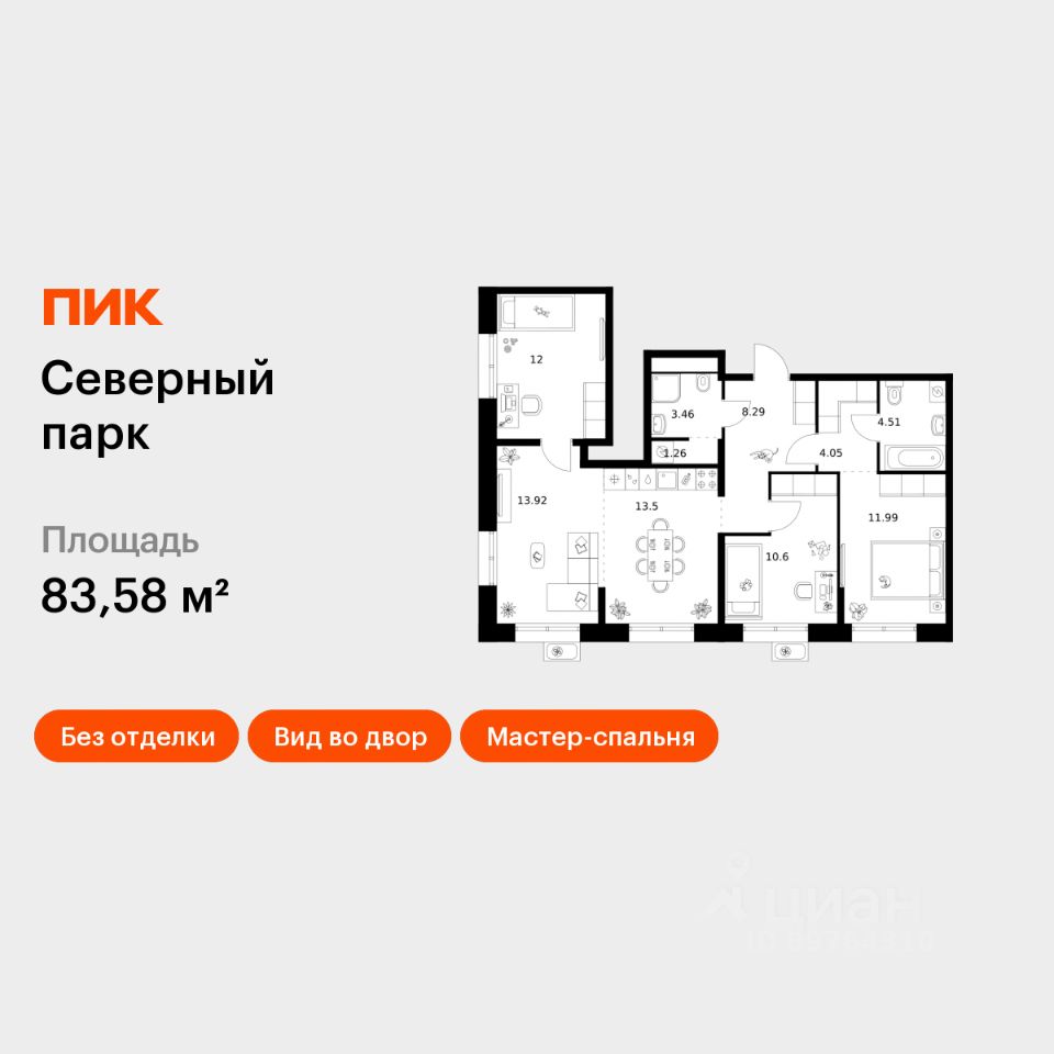 Продаётся 3-комн. квартира площадью 83,58 кв.м на 4 этаже 10 этажного дома (Корпус 11, Секция 2) проекта ПИК Северный парк. Светлый просторный подъезд на уровне земли, функциональная планировка, большие окна, без отделки. ''Северный парк'' - жилой квартал в развитом Железнодорожном районе Хабаровска с закрытыми дворами-парками, школой, детским садом и спортхабом. До центра города получится добраться за 10 минут на автомобиле. ''Северный парк'' возводится на пересечении улиц Воронежской и Совхозной, в 10 минутах езды от центра Хабаровска. В проекте будет 30 корпусов. Входы в подъезды ''Северного парка'' мы сделаем на уровне земли для комфортного перемещения по территории квартала любым способом: пешком, на самокате или с коляской. Благодаря панорамному остеклению, которое пропускает много естественного света, первые этажи будут просторные и светлые. В квартирах предусмотрены большие окна, застеклённые балконы и лоджии - будет светло и уютно даже зимой. Все квартиры сдаются с предчистовой или полной отделкой на выбор. В каждом дворе будет парк - тихое приватное пространство для жителей, где красиво и уютно в любое время года и можно расслабиться после рабочего дня. Через весь квартал протянется широкий пешеходный бульвар с велодорожками, велопарковками, зонами для отдыха, детскими и спортивными площадками. В ''Северном парке'' будет всё необходимое для комфортной жизни: на первых этажах откроются магазины, кафе и полезные сервисы. Внутри жилого квартала запланировано строительство школы и детского сада. Для удобства жителей предусмотрены многоуровневые паркинги, индивидуальные кладовые и колясочные. Артикул 989282 (Застройщик ООО ''СЗ ПРОЕКТ СТРОЙ'')