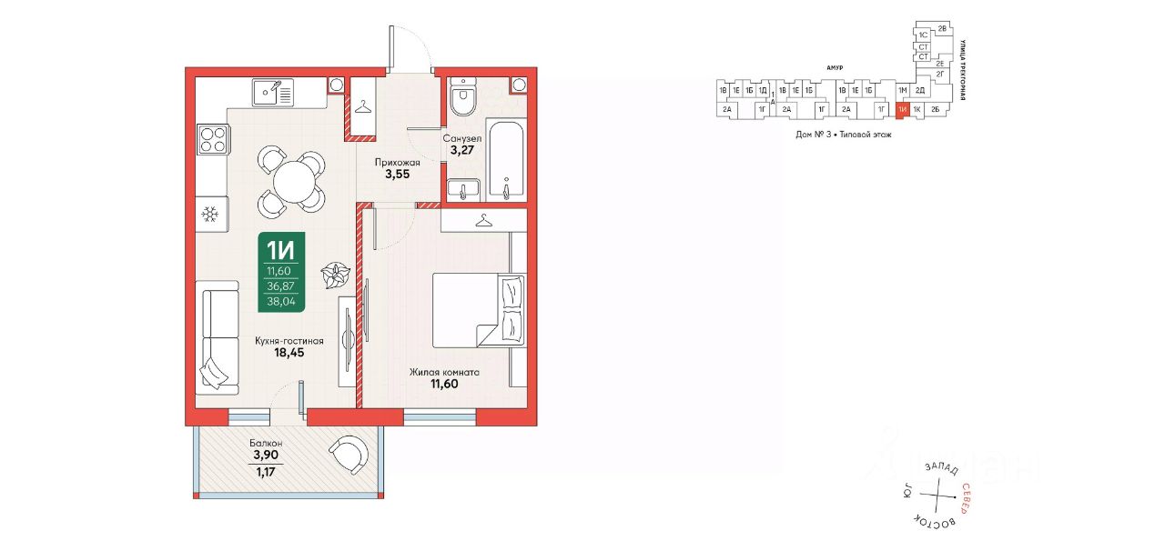Продаётся 1-комн. квартира площадью 38,03 кв.м на 3 этаже 10 этажного дома (Корпус 11, Секция 1) проекта ПИК Северный парк. Светлый просторный подъезд на уровне земли, функциональная планировка, большие окна, без отделки. ''Северный парк'' - жилой квартал в развитом Железнодорожном районе Хабаровска с закрытыми дворами-парками, школой, детским садом и спортхабом. До центра города получится добраться за 10 минут на автомобиле. ''Северный парк'' возводится на пересечении улиц Воронежской и Совхозной, в 10 минутах езды от центра Хабаровска. В проекте будет 30 корпусов. На входе в жилой квартал появится Welcome plaza - площадь с малыми архитектурными формами. Входы в подъезды ''Северного парка'' мы сделаем на уровне земли для комфортного перемещения по территории квартала любым способом: пешком, на самокате или с коляской. Благодаря панорамному остеклению, которое пропускает много естественного света, первые этажи будут просторные и светлые. В квартирах предусмотрены большие окна, застеклённые балконы и лоджии - будет светло и уютно даже зимой. Все квартиры сдаются с предчистовой или полной отделкой на выбор. В каждом дворе будет парк - тихое приватное пространство для жителей, где красиво и уютно в любое время года и можно расслабиться после рабочего дня. Через весь квартал протянется широкий пешеходный бульвар с велодорожками, велопарковками, зонами для отдыха, детскими и спортивными площадками. В ''Северном парке'' будет всё необходимое для комфортной жизни: на первых этажах откроются магазины, кафе и полезные сервисы. Внутри жилого квартала запланировано строительство школы и детского сада. Для удобства жителей предусмотрены многоуровневые паркинги, индивидуальные кладовые и колясочные. Артикул 989149 (Застройщик ООО ''СЗ ПРОЕКТ СТРОЙ'')