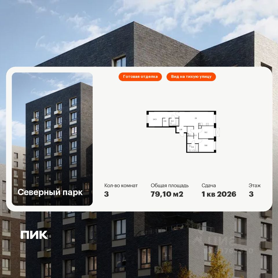 Продаётся 3-комн. квартира площадью 79,1 кв.м на 3 этаже 10 этажного дома (Корпус 7 , Секция 3) проекта ПИК Северный парк. Светлый просторный подъезд на уровне земли, функциональная планировка, большие окна, c отделкой.
