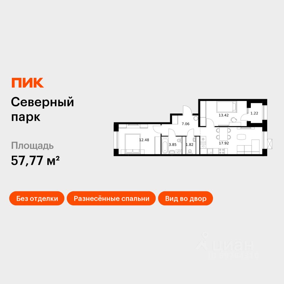 Продаётся 2-комн. квартира площадью 57,77 кв.м на 10 этаже 10 этажного дома (Корпус 10, Секция 1) проекта ПИК Северный парк. Светлый просторный подъезд на уровне земли, функциональная планировка, большие окна, без отделки.
