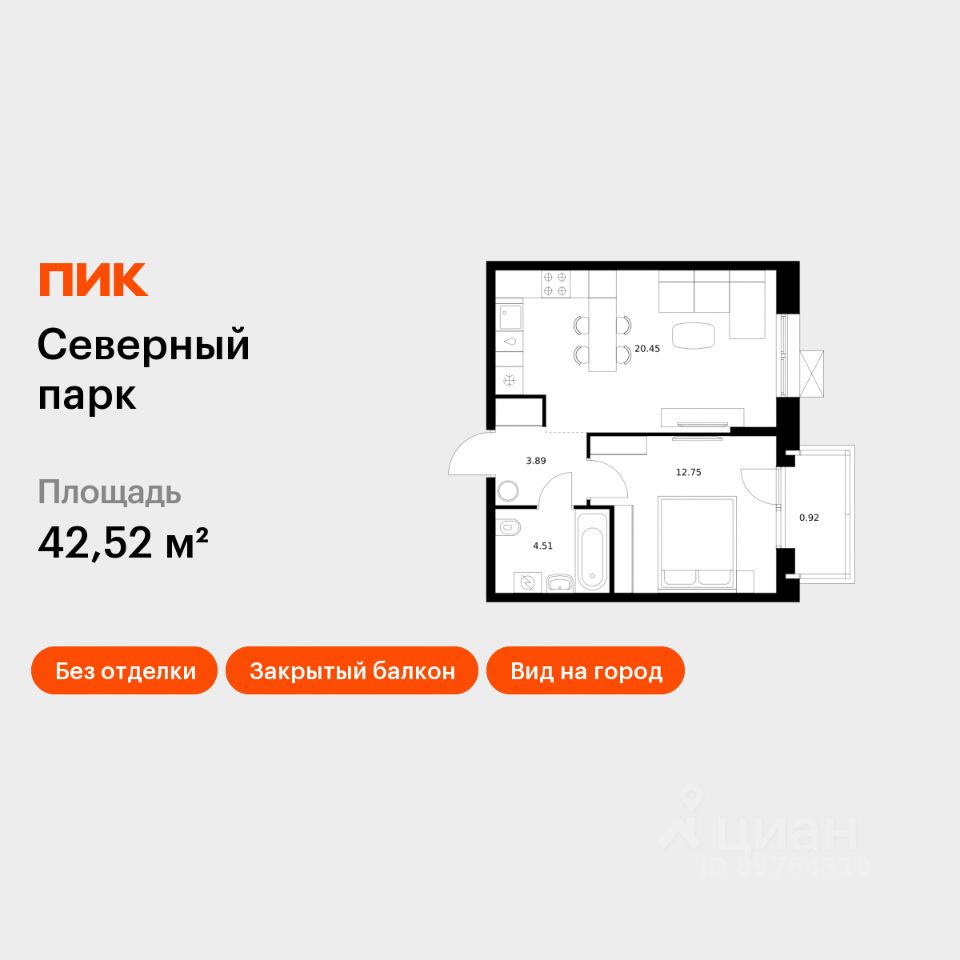 Продаётся 1-комн. квартира площадью 42,52 кв.м на 2 этаже 10 этажного дома (Корпус 12, Секция 1) проекта ПИК Северный парк. Светлый просторный подъезд на уровне земли, функциональная планировка, большие окна, без отделки.