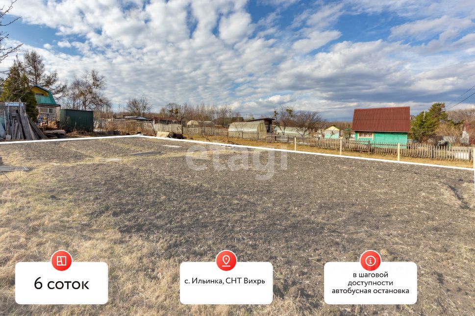 Продам хороший дачный участок ровной прямоугольной формы, 6 соток с. Ильинка СНТ ''Вихрь'' без домика, что позволяет построить свой дом мечты. На участке имеются насаждения: ягодные и фруктовые посадки. Рядом с участком расположен электрический столб, что облегчит подключение к электроснабжению. В 20 метрах находится водоем. Автобусная остановка в шаговой доступности, дорога хорошая до участка. Земля плодородная, разработана. Произведено межевание. Звоните и записывайтесь на просмотр!!!