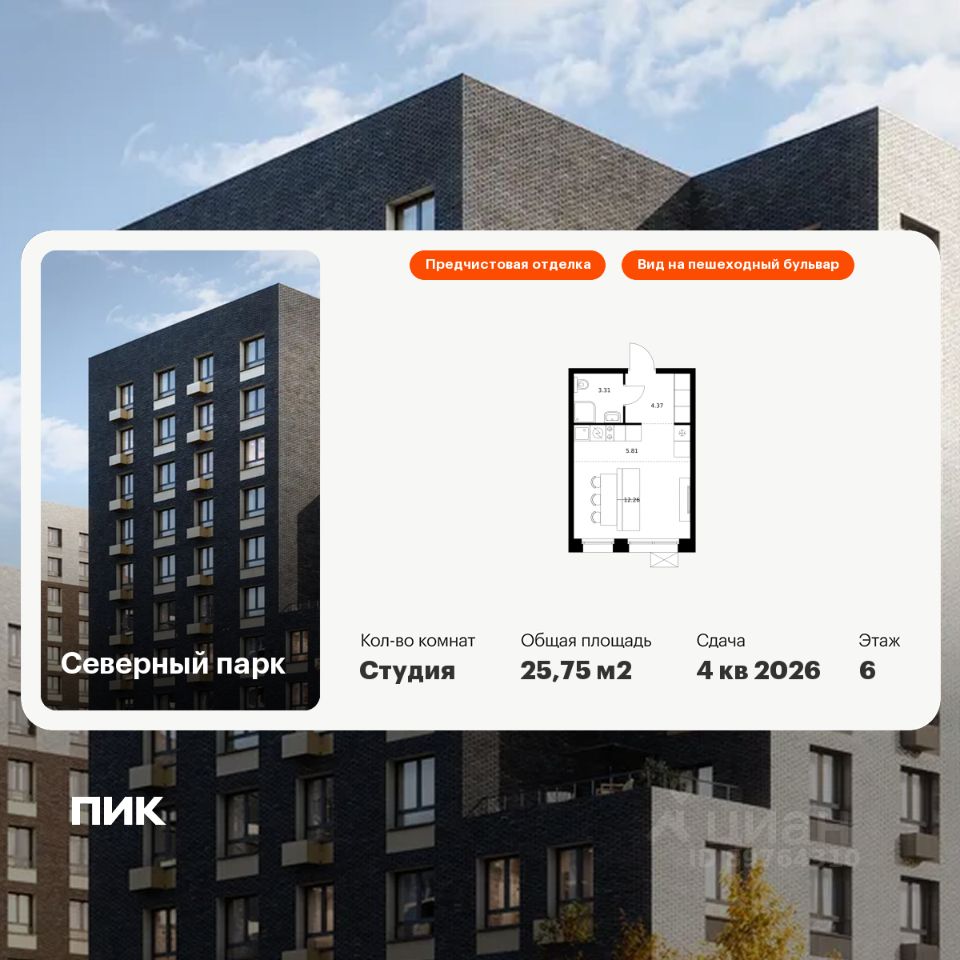Продаётся квартира-студия площадью 25,75 кв.м на 6 этаже 10 этажного дома (Корпус 8, Секция 1) проекта ПИК Северный парк. Светлый просторный подъезд на уровне земли, функциональная планировка, большие окна, предчистовая отделка.