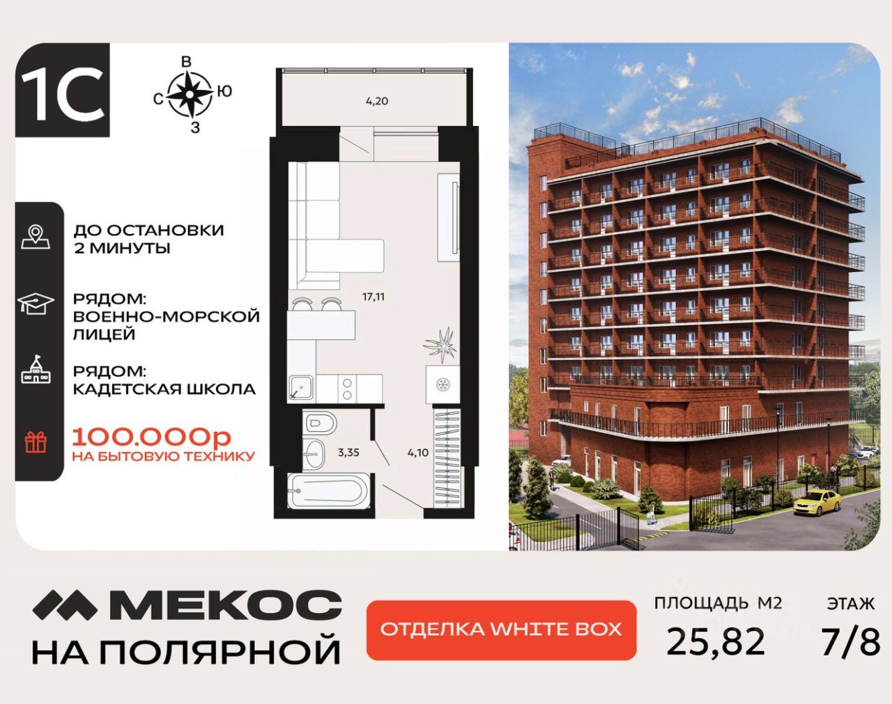 ЖК Мекос на Полярной это: Современный дом из красного кирпича - новая архитектурная доминанта Северного. - стены дома из красного кирпича, с утеплителем а это самая лучшая конструкция, которая не только теплая, но в и отлично изолирует внешний шум (более чем в 2 раза по сравнению с панельным и монолитным домом). Всего 9 этажей и 60 квартир. - до центра города 20 мин на автомобиле - закрытая благоустроенная территория с зонами отдыха детей и взрослых - большая бесплатная парковка, места хватит всем - видеонаблюдение по всем видовым точкам двора и дома - стильная отделка холла со светопрозрачной входной группой