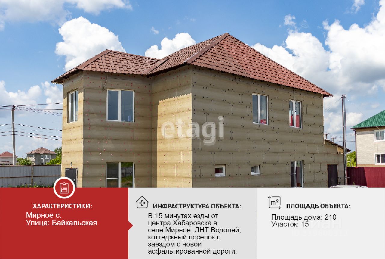 Если любите роскошь, совмещенную с загородным уютом, то это ВАШ вариант! Шикарный коттедж в два этажа! Площадью 210 кв. м., четыре комнаты, 2017 года постройки, в 15 минутах езды от центра Хабаровска в в селе Мирное, ДНТ Водолей, коттеджный поселок с заездом с новой асфальтированной дороги. Коттедж продуман до мелочей, делалось для себя с душой, материалы отсева блок -утеплитель пеноплекс. На каждом этаже санузел и ванная комната, просторная кухня-гостиная, кабинет для работы, большие спальни и гардеробная, а также кладовые. Электричество 380 В 15 кВт. Вода привозная- ёмкость на 5 кубов. Септик 9 кубов. Тепло в доме от экономичного комбинированного котла электрический/ твёрдотопливный (платёж до 7 тыс. руб. зимой), по первому этажу тёплый пол, на втором этаже радиаторы отопления. После продажи остается почти вся мебель, бойлер на 120 литров и бытовая техника. Участок 15 сот. (огорожен профлистом), Категория: земли населённых пунктов, для ведения дачного хозяйства и организации застройки территорий Дачного некоммерческого товарищества ''Водолей''. Въезд на территорию оборудован распашными воротами, просторная зона парковки. Документы готовы. Всего не описать это надо смотреть. ВИДЕО по КОТТЕДЖУ есть. ПОДХОДИТ ПОД ДАЛЬНЕВОСТОЧНУЮ ИПОТЕКУ Звоните, не упустите шанс жить в шикарных условиях, в пригороде города Хабаровска!