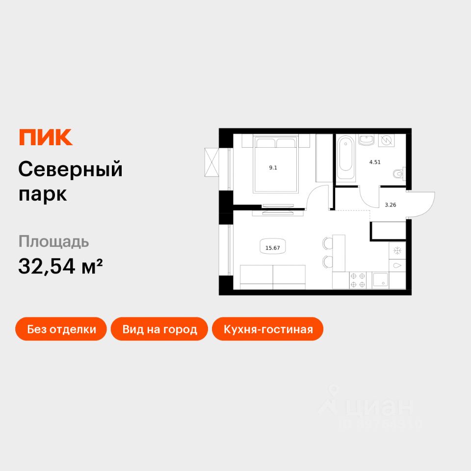 Продаётся 1-комн. квартира площадью 32,54 кв.м на 10 этаже 10 этажного дома (Корпус 10, Секция 2) проекта ПИК Северный парк. Светлый просторный подъезд на уровне земли, функциональная планировка, большие окна, без отделки.
