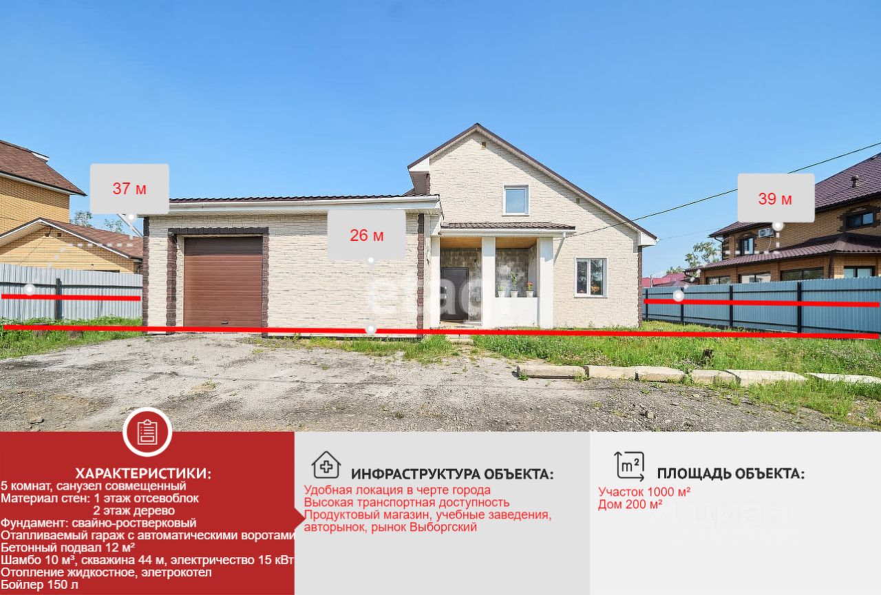 Продам 2-х этажный просторный дом в 15 минутах езды от центра города. Приобретая этот дом, вы приобретаете прекрасную локацию в черте города со всеми преимуществами доступности инфраструктуры, престижное соседство - поселок застроен современными дорогими коттеджами, удобство и комфорт частного дома с личным отапливаемым гаражом и участком, эргономичную планировку, 5 комнат и общую площадь дома 200 м². Высота потолка 2,9 м. Автономные коммуникации: шамбо 12 м, скважина 44 м, отопление электрокотёл. Фундамент свайно-набивной с роствергом с залитой плитой, что обеспечит надёжность и долговечность постройки. Материал стен отсевоблок, мансардный этаж дерево. Теплый гараж 46 м² с автоматическими воротами, бетонный подвал 12 м² - доступ из гаража. Дом строили для себя и использовали современные технологии строительства и материалы. Площадь участка 10 сот. Ещё две сотки можно оформить в собственность. По всем вопросам обращайтесь по указанному номеру, с удовольствием отвечу!