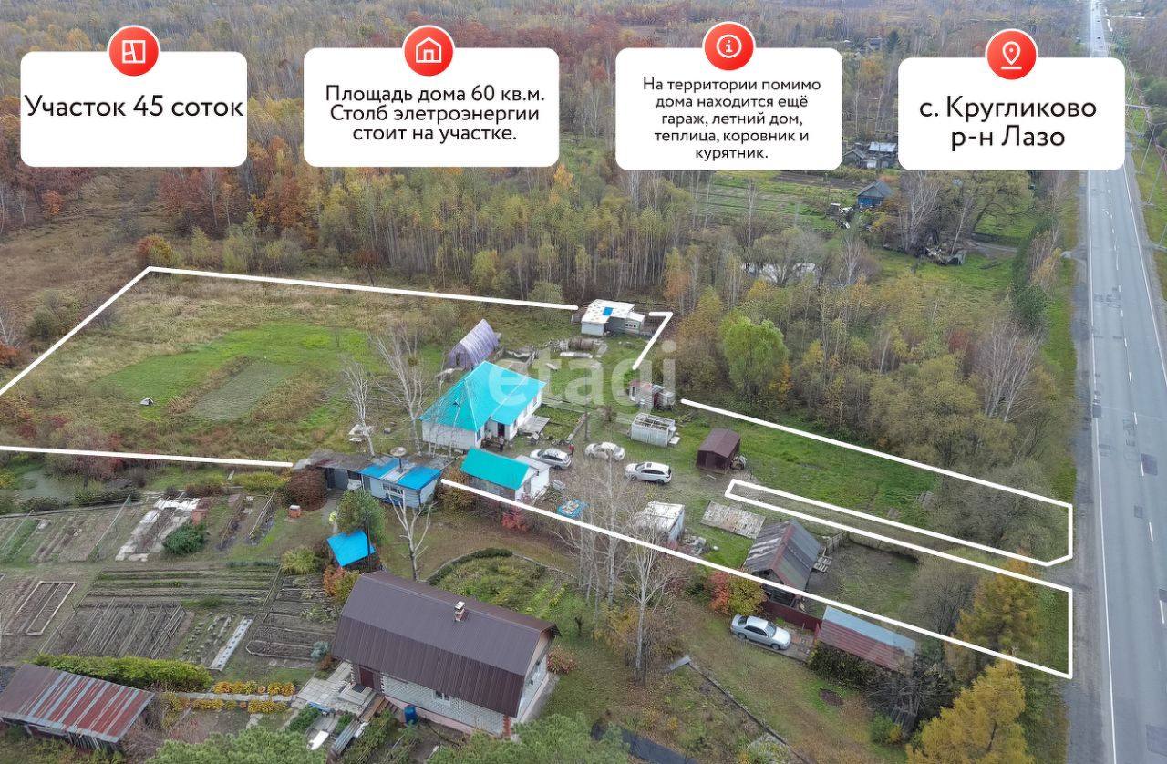 Продаётся жилой дом 40 м.кв.в селе Кругликово, р-н Лазо по Владивостокскому шоссе. Дом расположен на большом земельном участке 45 соток.
