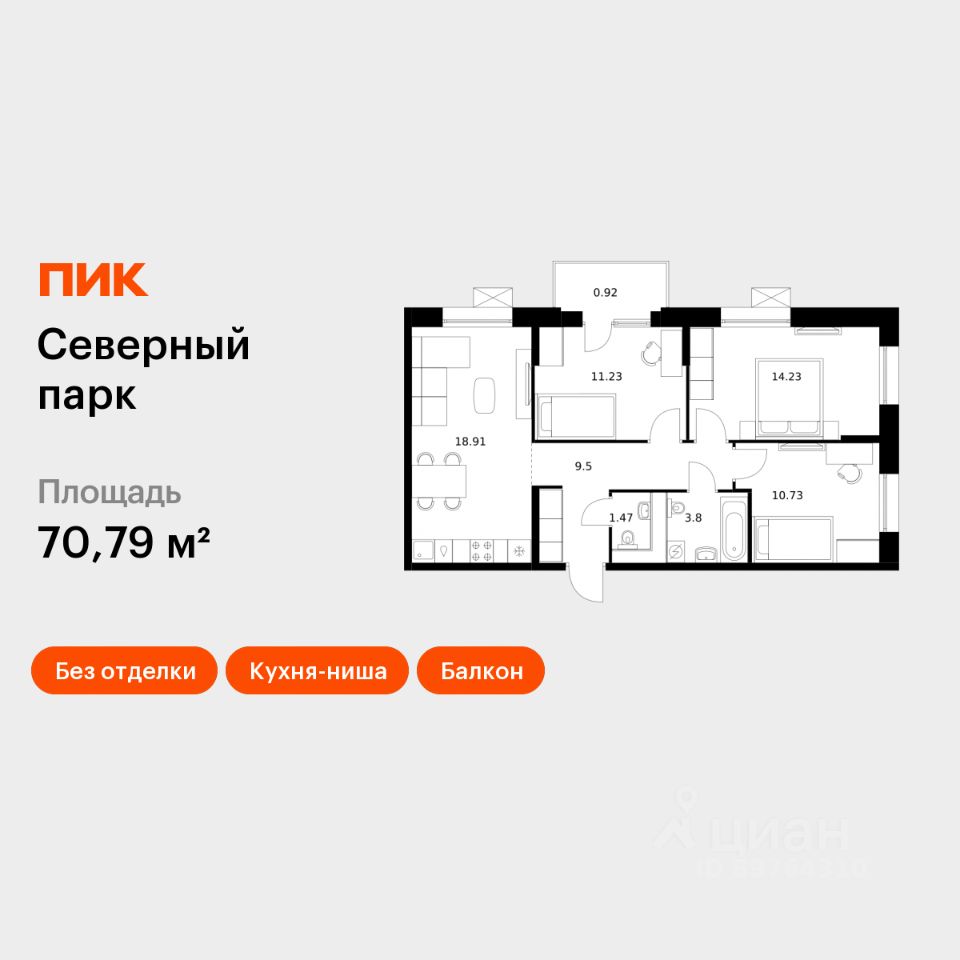 Продаётся 3-комн. квартира площадью 70,79 кв.м на 8 этаже 10 этажного дома (Корпус 10, Секция 2) проекта ПИК Северный парк. Светлый просторный подъезд на уровне земли, функциональная планировка, большие окна, без отделки.