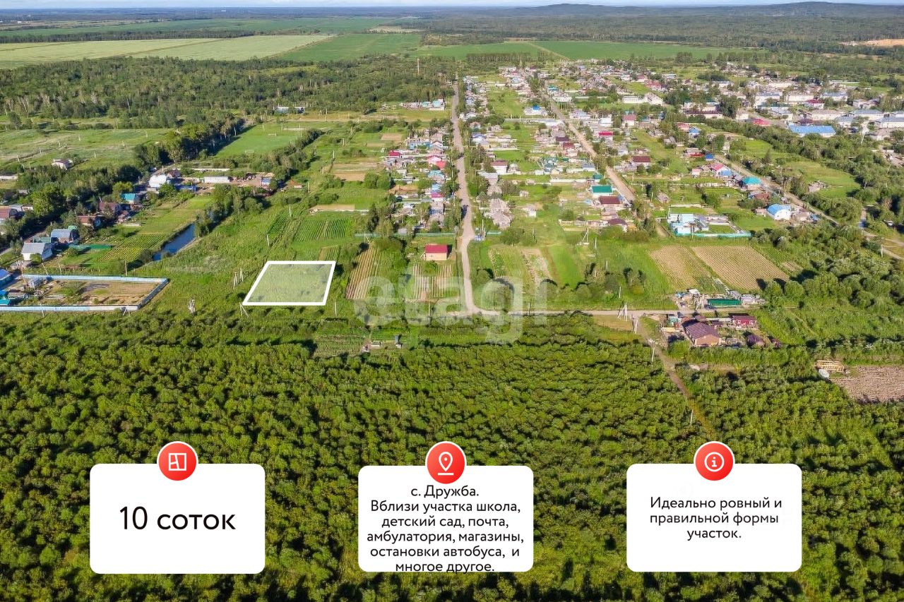 Продается уютный земельный участок под индивидуальное строительство в селе Дружба, Хабаровский район! Площадь: 10 соток Идеально ровный и правильной формы участок Тихий, спокойный район — место для комфортной жизни вдали от шума шоссе Обустроенная инфраструктура в пешей доступности: школа, детский сад, почта, амбулатория, администрация, дом культуры, магазины, остановки автобуса, футбольная площадка и многое другое Почему выбирают именно этот участок?