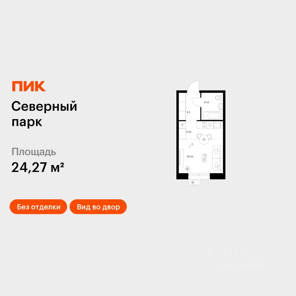 Продаётся квартира-студия площадью 24,27 кв.м на 2 этаже 10 этажного дома (Корпус 11, Секция 2) проекта ПИК Северный парк. Светлый просторный подъезд на уровне земли, функциональная планировка, большие окна, без отделки.