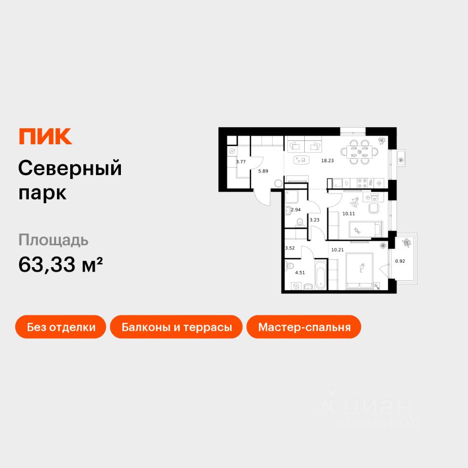 Продаётся 2-комн. квартира площадью 63,33 кв.м на 6 этаже 10 этажного дома (Корпус 11, Секция 4) проекта ПИК Северный парк. Светлый просторный подъезд на уровне земли, функциональная планировка, большие окна, без отделки.