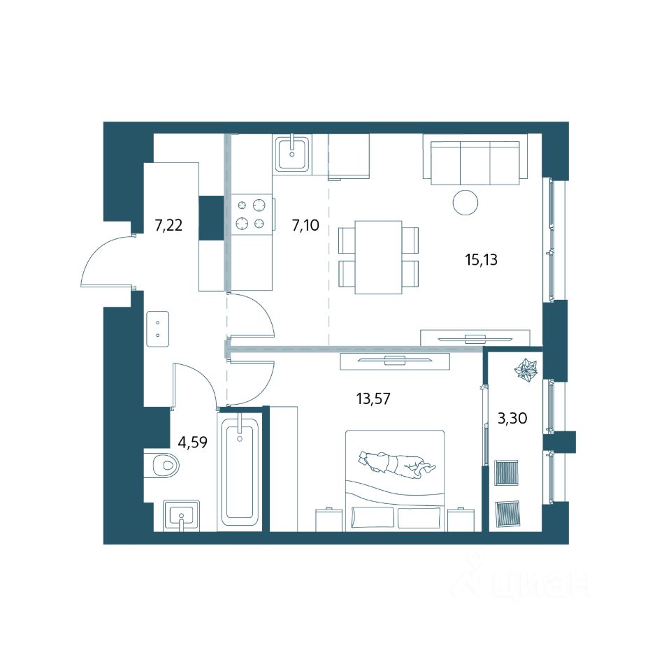 О КВАРТИРЕ Квартира площадью 51,11м2. При входе имеется просторная гардеробная зона Большая кухня-гостиная площадью 22,23м2 Изолированная спальная комната 13,57м2 с выходом на лоджию с панорамным остеклением! Санузел площадью 4,59м2.