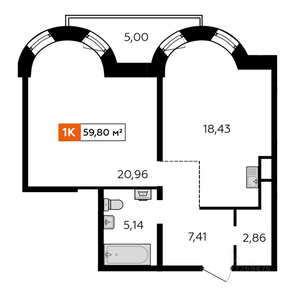 Продаётся 1-комнатная квартира 59,45 м2 от застройщика в жилом комплексе ''Аккорд''.