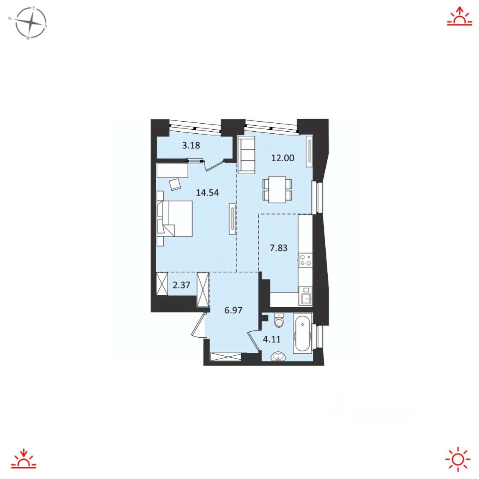 О КВАРТИРЕ Площадь 51м2 Светлая и просторная комната 14,54м2 с выходом на балкон. Кухня-гостиная с двумя окнами 19,83м2 с возможностью изолировать еще одну комнату.