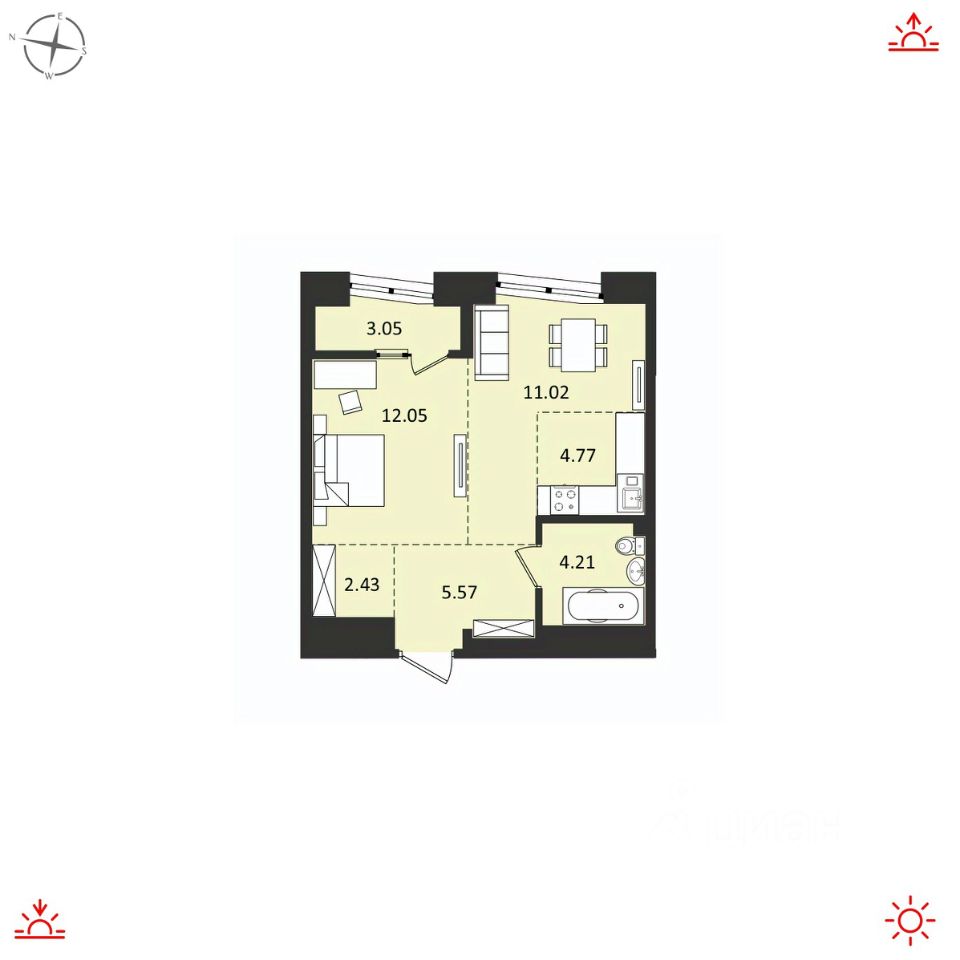 О КВАРТИРЕ Площадь 43,1м2 Продуманная и гармоничная планировка квартиры обеспечивает максимум комфорта и удобства для каждого жильца. Изолированная комната с гардеробной зоной и выходом на балкон Кухня-гостиная правильной формы, площадь 15,79м2 Совмещенный санузел