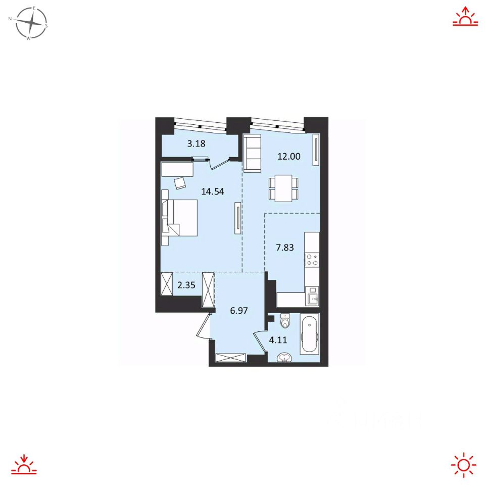 О КВАРТИРЕ Площадь 51м2 Функциональная планировка, которая обеспечивает комфортное использование пространства. Изолированная комната площадью 14,54м2 с выходом на балкон. Просторная кухня-гостиная 19,83м2. В прихожей предусмотрена ниша для встроенной мебели. Качественная предчистовая отделка.