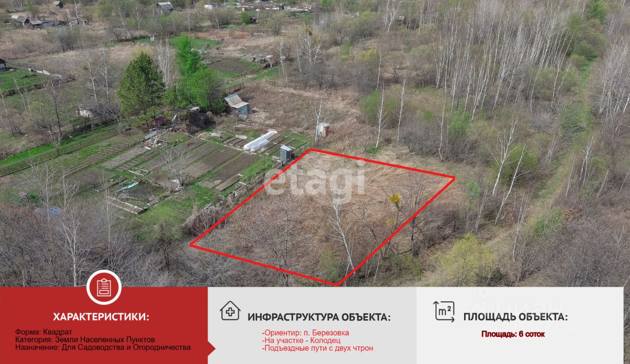 В продажу вышел участок 6 соток. СОО Лесное в развивающемся районе п. Березовка. Участок правильной квадратной формы, немного под уклоном, что позволяет после дождей воде не стоять на участке. Не далеко находится поселок Березовка. До центра города на автомобиле 15-20 минут. Межевание проведено. На участке есть колодец. Категория земель: Земли населенных пунктов, Вид: Для Садово - Огородного участка. Участок расположен таким образом, что с двух сторон соседи, а с других двух сторон дорога (подъездные пути хорошие).Документы в порядке, один взрослый собственник. Звоните,задавайте вопросы. Покупайте, пока цена еще приемлемая. Торг в разумных пределах.