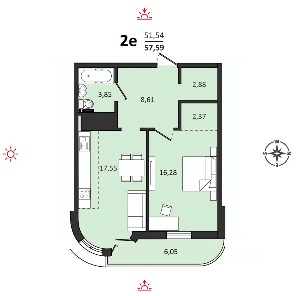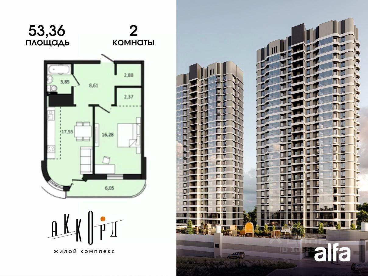 Продаётся 2-комнатная квартира 57,59 м2 от застройщика в жилом комплексе ''Аккорд''.
