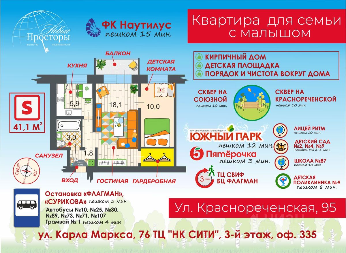 Квартира для семьи с малышом Краснореченская 95 Это не просто историческая часть Индустриального района, это очень удобное место и вот почему: По соседству два сквера (много зелени, можно гулять) Рядом с Администрацией и Судом (порядок и чистота) САМОЕ УЗКОЕ место между П.Морозова и Краснореченской, а это значит, что до ост.Сурикова 2 минуты пешком, а до ост Администрация Инд.р-на 3 минуты пешком Таким образом удобная транспортная доступность автобусов 10, 25, 30, 89, 73, 71, 107 Пятерочка, ТЦ СВИФ, БЦ Флагман - 3 минуты пешком Детские сады 2, 4, 9 - от 2 до 5 минут пешком Детская поликлиника 9 - 8 минут пешком До школы 87 - 10 минут пешком До лицея Ритм - 12 минут пешком Южный парк и Наутилус - 15 минут пешком