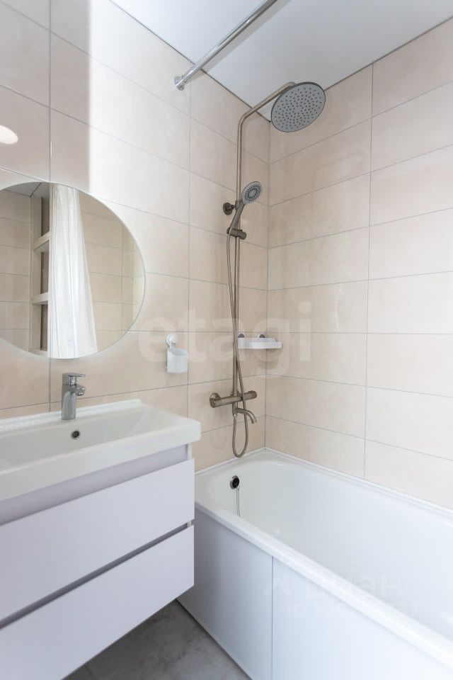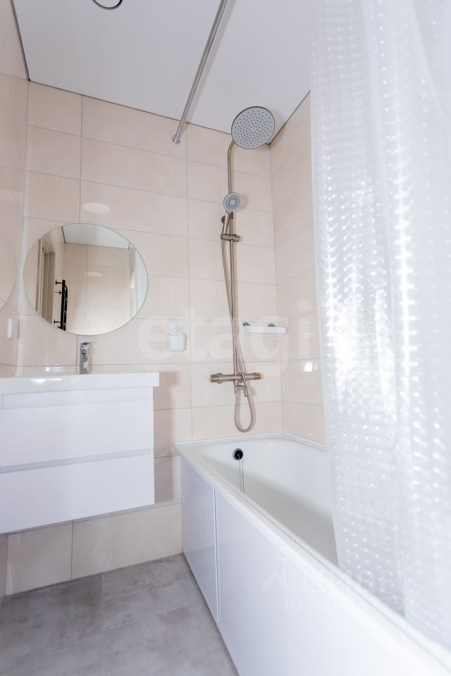 Ванная комната с современной отделкой, теплым полом и водонагревателем.