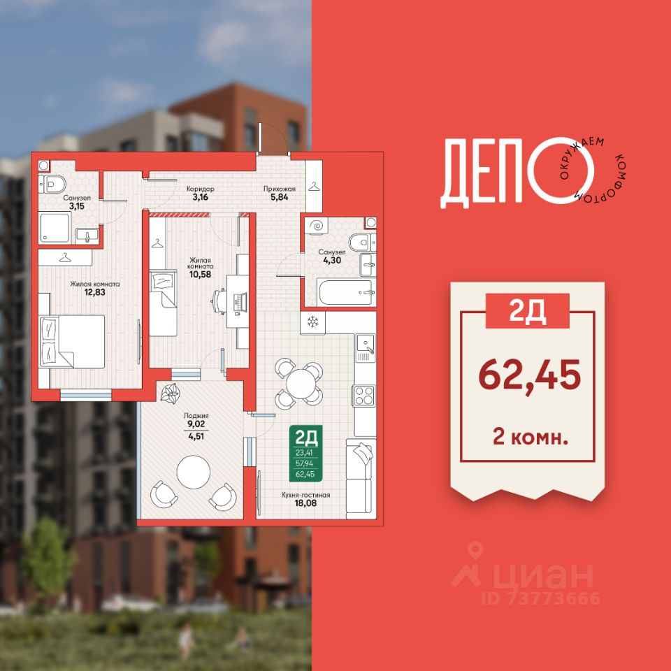 Эта двухкомнатная квартира площадью 62,45 м² сочетает в себе комфорт, функциональность и современные решения для удобной жизни.