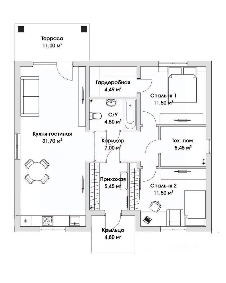 О доме: Площадь: 111 кв. м. по полу. Планировка: 2 просторные спальни (одна с собственной гардеробной), светлый санузел, практичное техпомещение и большая кухня-гостиная 31.7 кв.м. с выходом на собственную террасу. Коммуникации: Собственная скважина, современный септик ''Топаз'', система фильтрации. Электрическое отопление (котел Zota) с дистанционным управлением + теплый водяной пол по всему дому. Важно: участок газифицирован, и газ можно подвести в дом в следующем году.