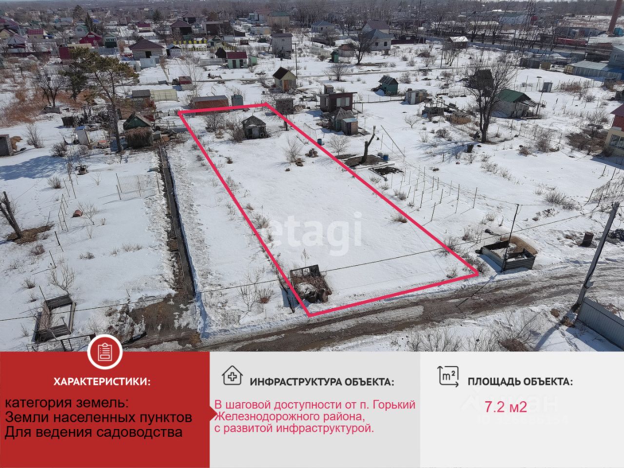 Земельный участок 7.2 соток, расположен в с/т ''Мичурина'' в шаговой доступности от п.Горького с развитой инфраструктурой. Близлежащая территория активно застраивается.
