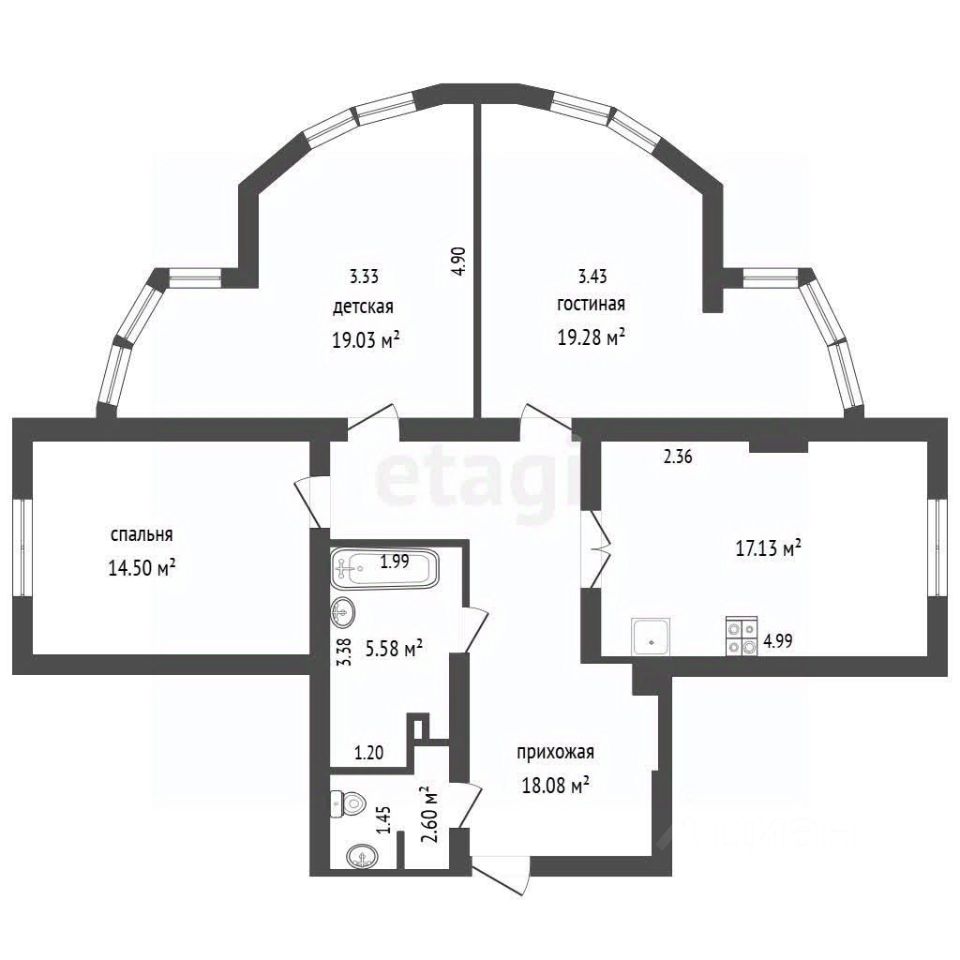 Простор для семьи на долгие годы. 92 м² общей площади, из них 76 м² — жилые, Три раздельные комнаты и большая кухня-гостиная 16 м². Здесь будет удобно и родителям, и детям.