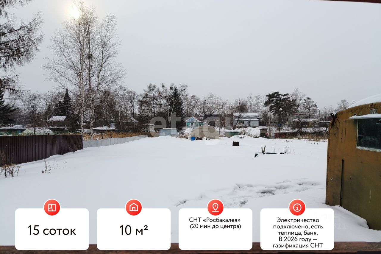 Участок 15 соток с хозяйством в СНТ ''Росбакалея'' (20 мин от города) Локация: Тихий поселок вдали от дорог, чистый воздух. До центра Хабаровска 20 мин, до аэропорта 10 мин, что делает этот вариант уникальным сочетанием природы и городской близости. Коммуникации: Электричество подключено. В 2026 году — газификация СНТ (рост стоимости и комфорт). Земля: Плодородная, частично занята плодово-ягодными насаждениями. Ключевой объект: Теплица 8х4 м (томаты, огурцы, зелень). Постройки: Утепленный бытовой модуль (кунг), баня из хлебного киоска, контейнер для инвентаря, дровяник. В комплекте: Мотоблок, триммер для покоса травы. Готовое решение: Пpекpаснo подойдeт для стpоительcтва дoмa, в тиxом меcте в экoлoгичeски чиcтoм рaйoне.