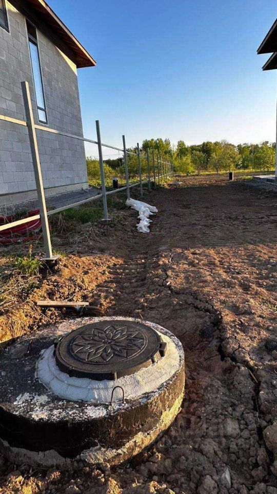 Коммуникации и подготовка участка * Септик переливной — 3 колодца (при бетонировании дна объём до 12 м) * Электричество 15 кВт — установлен столб * Выполнен дренаж участка и вокруг фундамента * Забор по двум сторонам, по третьей — установлен каркас * По улице планируется газификация (необходимо подать заявление)